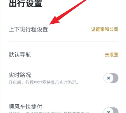 在出行设置页面中点击“上下班行程设置”选项,进入上下班行程设置页面。