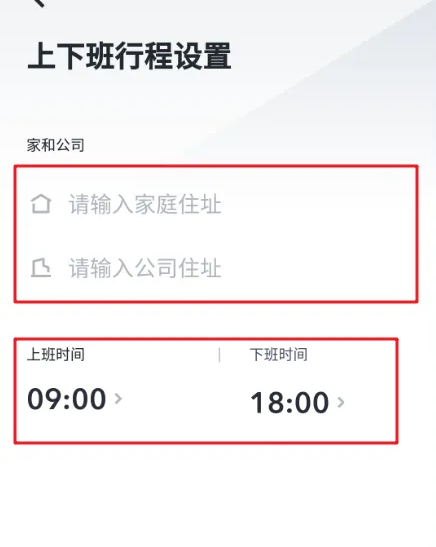 在上下班行程设置页面分别设置家庭住址和公司住址(可以理解为出发地和目的地),在时间框中设置上班时间和下班时间(可以理解为从出发地出发的时间和从目的地出发的时间)。点击底的“确认提交”,即可。