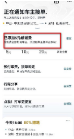 4、点击出发后,就可以发布拼车订单了,在订单页面,选择感谢费数额,然后点击添加。