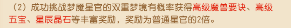 挑战成功后,不仅有概率获得普通星官2倍的奖励(包括高级魔兽要诀、法宝精华、星辰晶石等珍稀道具),此外在全服放出后首通双生·梦魇星官的队伍还将解锁首通成就,记录在服务器的荣耀史册中哦~