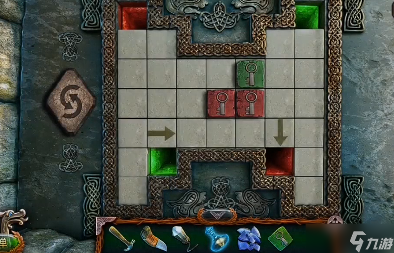 拿到钥匙块后,把它放在场景左边的柱子上会触发一个小游戏。这个小游戏的目标是通过移动方块让钥匙块归位。首先把左边的红色方块往左移动,再往下移动解锁新的绿色钥匙块。接着把绿色方块移到左边,再转移到红色块下方让其归位。然后把红方块移动到上方的红空格里,新出现的绿方块移到右边并向上推,直到绿方块归位。最后移动红方块到箭头上方,它会自动进入红洞口,小游戏就完成了。
