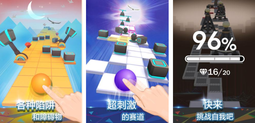 不同于传统二维平面跑酷,这款游戏采用立体轨道设计,玩家控制一个小球在复杂多变的三维赛道上滚动。每个关卡拥有独立主题与背景音乐,配合动态灯光效果营造沉浸氛围。赛道中不仅有常规障碍,更有大量尖刺分布在关键位置,要求玩家精准把握移动时机,才能安全抵达终点。