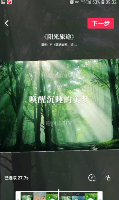 选择抖音图标,点击,弹出抖音编辑视频,这里可以编辑一个30秒以内的视频,拖动下图箭头所指的部位,选择心仪的歌曲片段,点击下一步