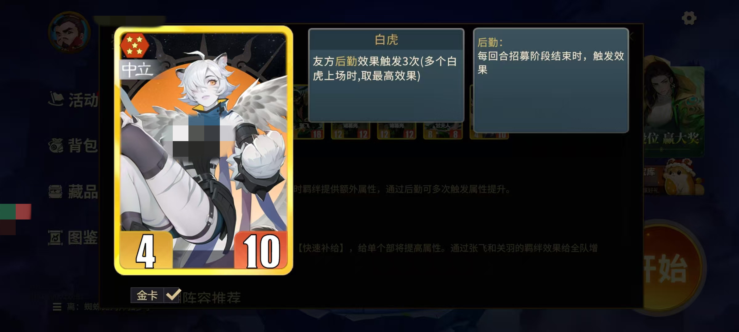 在实际运营过程中,前期可选用张星彩与蜀卒组成过渡阵容,利用蜀卒为张星彩提供属性加成并激活阵营羁绊,确保前期具备足够的抗压能力,有效维持血线健康。进入中期后,可用甘夫人替代蜀卒,进一步提升团队辅助能力,同时搭配赵云与张星彩形成稳固战线。姜维也是可选角色之一,其技能能提供稳定的补给支持,助力平稳过渡。后期则聚焦于核心输出单元——关羽、张飞、诸葛亮与白虎的组合。依靠诸葛亮持续产出锦囊,反复触发关羽或张飞的增益状态,而白虎的存在能使后勤效果多次释放,进一步叠加核心输出的属性成长。