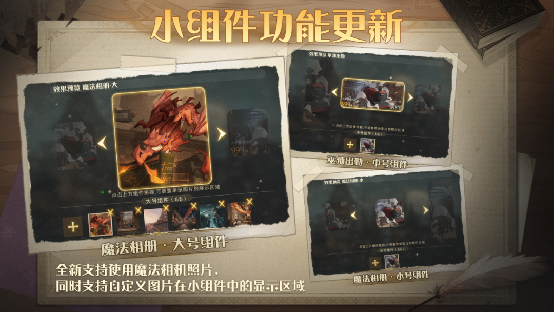 “魔法相框”可以支持巫师使用魔法相机拍摄的照片了,快用绝美的魔法照片妆点设备桌面吧!同时,现支持自定义设置设定集图片和魔法相机照片在小组件中的显示区域。