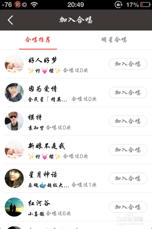 3.此合唱共有两个栏目,一个是合唱推荐,一个是与明星合唱,找到自己喜欢的歌或者想合唱的朋友,点右侧的加入合唱即可。