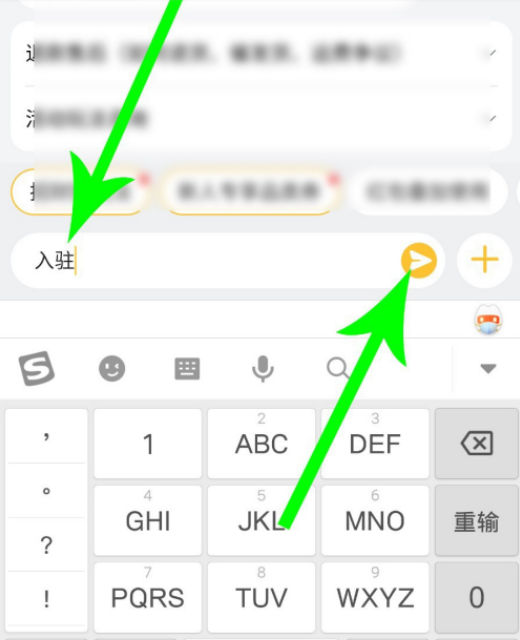 4.打开我的客服界面点击“输入框”,然后在输入框中编辑文字“入驻”,接着点击“发送”。