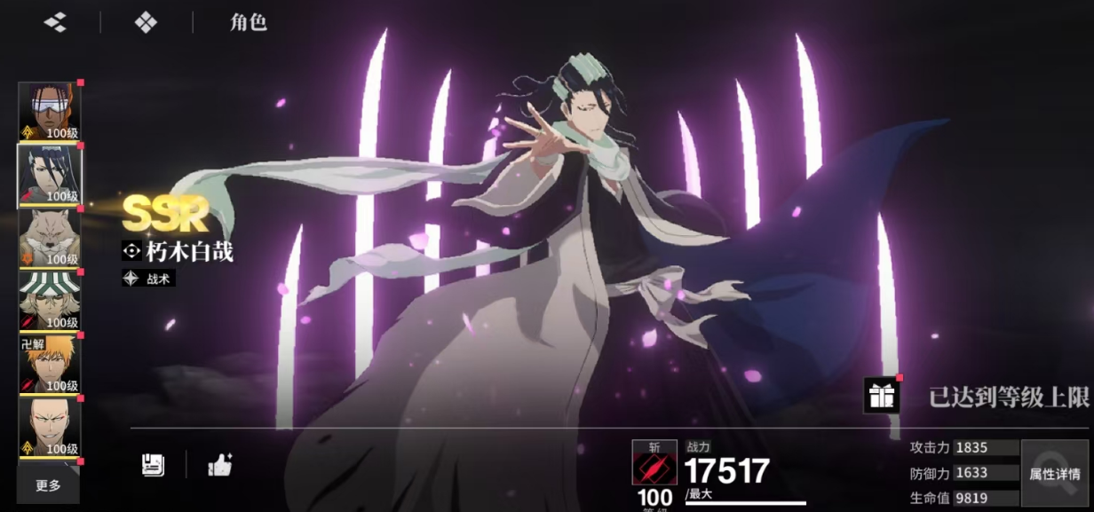 战斗位置上可以选择朽木白哉,他的战斗技能脱手之后就可以释放,放完技能之后也可以马上切换成其他的角色。战斗技能,还可以迅速的打出伤害,可以轻松的实现后台输出,更关键的是战场技能就可以有效降低敌人的抗性。