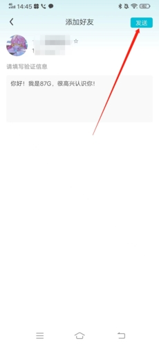 4、最后点击右上角的“发送”向该用户发送好友申请,等待对方通过后就能成功加上好友了。