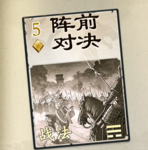 接下来介绍部分常见战法牌。首先是“阵前对决”,使用时需选定一名对手,随后双方轮流打出杀,直至有一方无法继续响应为止。最终无法出杀的一方将承受1点伤害,属于典型的拼资源战术。