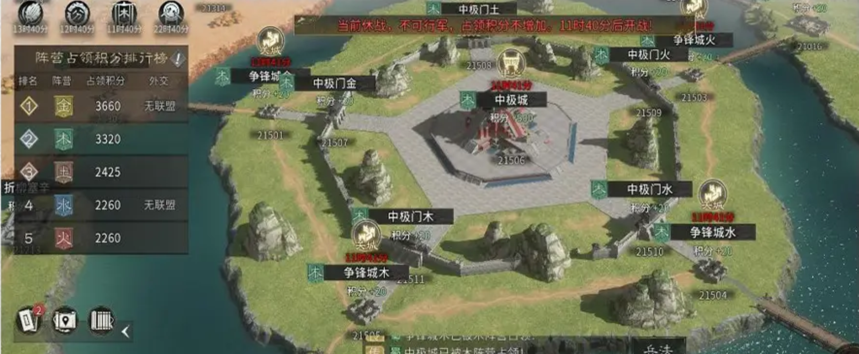 在“群雄逐鹿”中,【联盟外交】机制扮演着至关重要的角色。当战局陷入胶着,阵营间的博弈进入关键阶段,由首日战功最高的玩家担任的“纵横家”便可主导外交动向。该玩家有权代表本阵营发起结盟请求,促成两个敌对阵营暂时停战,联合应对强敌或共享战略资源。结盟协议于次日生效,持续一整天。在此期间,双方阵营禁止相互攻击,可自由通行对方领地,且共同占领城池所获积分将被平均分配,极大增强了策略协同的空间。