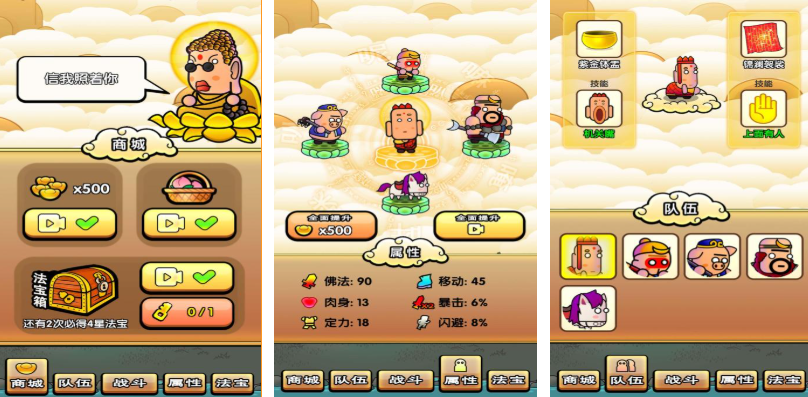 这是一款结合西游题材与肉鸽机制的搞笑放置类游戏,角色采用大脑袋小身子的Q版设定,表情丰富且动作滑稽。故事重新演绎经典取经历程,融入大量现代梗与恶搞桥段。玩家可通过点击进行角色升级与阵容调整,挂机也能获得资源收益,同时包含寻宝、互动等多样化小游戏内容,可玩性高。