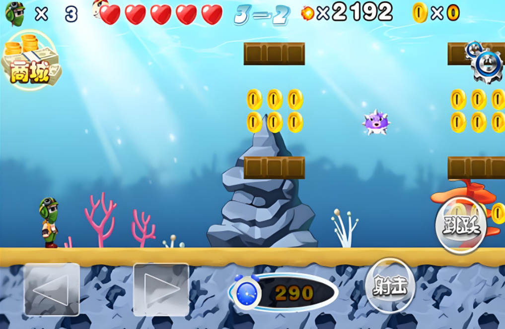 这款游戏让大家变身为大家记忆深处那个再熟悉不过的玛丽形象,大鼻子,穿工作服,戴红帽,大家可以控制他进行冒险之旅。游戏操作简单,你只需点触4个虚拟按键,就可以控制玛丽左右上下移动。游戏特别在路上放置了一些有着千奇百怪作用的道具,只要大家进行拾取使用,就可以变大,或者速度暴增、隐身等。