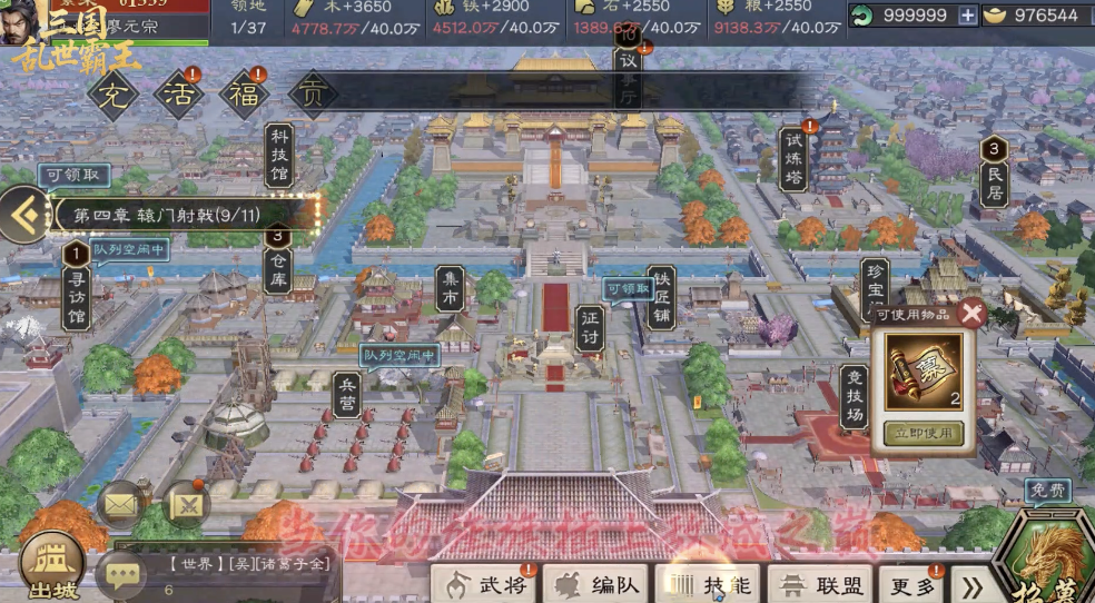 玩家需要内修内政科技,提升城池的各项能力;外练军事战术,增强军队的战斗力。注意要建筑城墙抵御外敌的入侵,积蓄军粮保障军队的供给,采集资源发展生产。