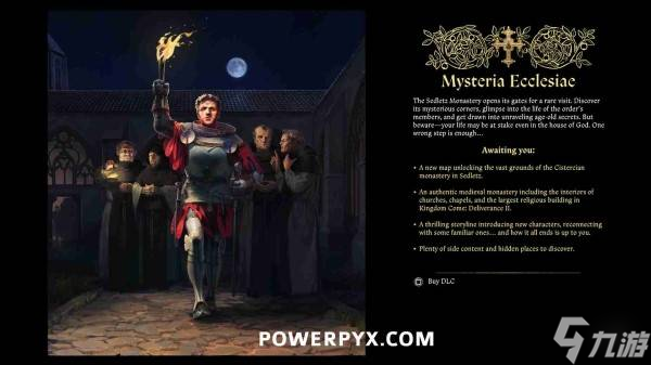 此DLC包含一张新地图,解锁了赛德莱茨修道院的广阔场地;一个真实的中世纪修道院,包括教堂、小礼拜堂的内部,以及《天国拯救2》中最大的宗教建筑;一条引人入胜的故事线,加入了新角色,并与一些熟悉的面孔重逢……以及双结局。以及大量的支线内容和隐藏地点可供探索。
