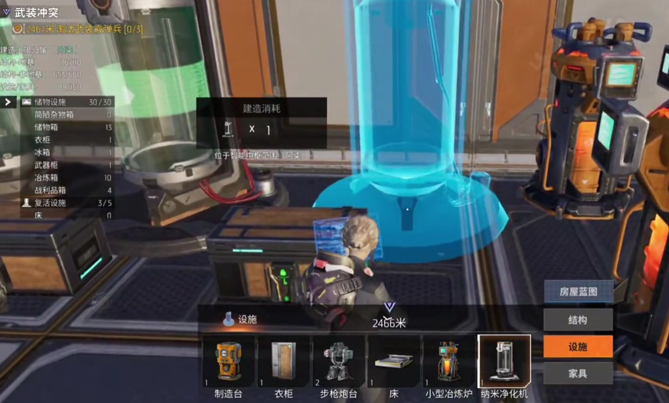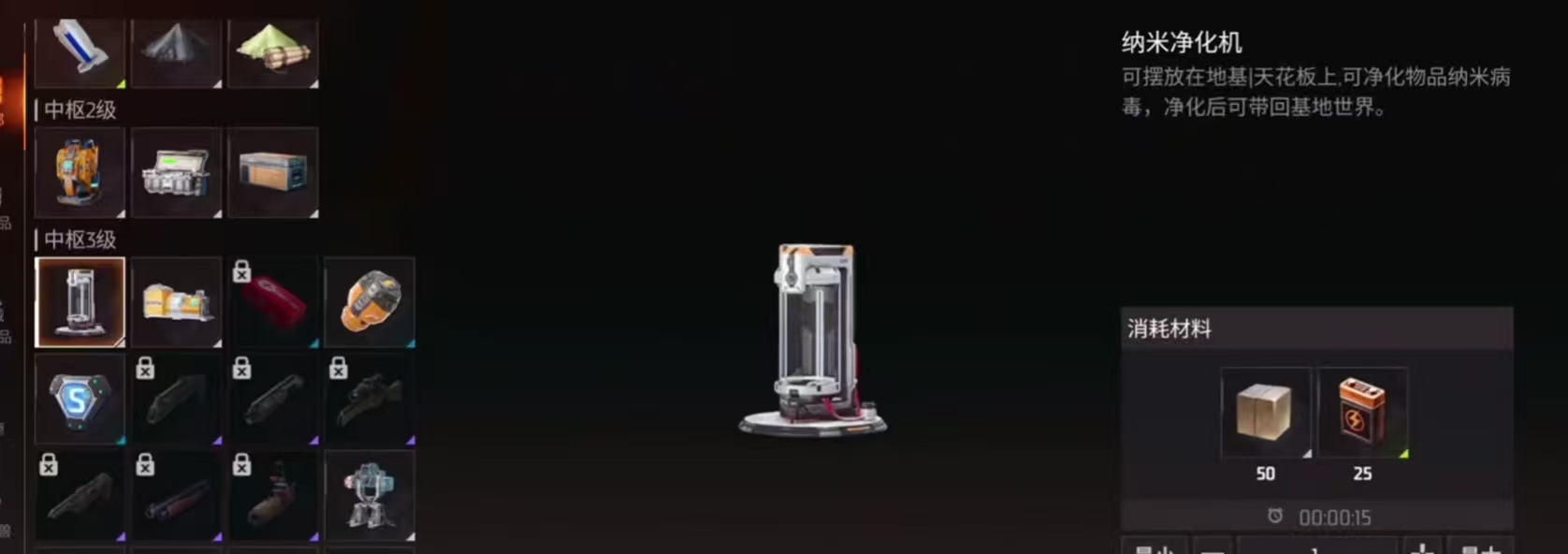 想要顺利将战局中的物品带回基地,第一步是确保拥有一个工作台。工作台是前期必须优先解锁的核心设施,需使用零件进行建造。一旦获得工作台,便可打开其制造界面,找到并制作“纳米净化机”。该设备是实现物资转移的关键工具。制作完成后,需在合适的位置部署纳米净化器,因为所有从战场拾取的物品都必须经过它的净化处理,才能被带入基地系统。