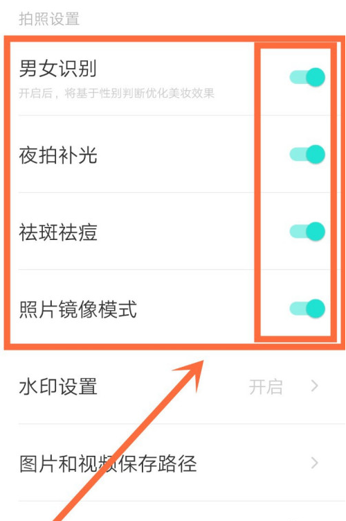 进入设置界面后,分别点击【男女识别、夜拍补光、祛斑祛痘和照片镜像模式】后面的【开启按钮】进入。如下图所示