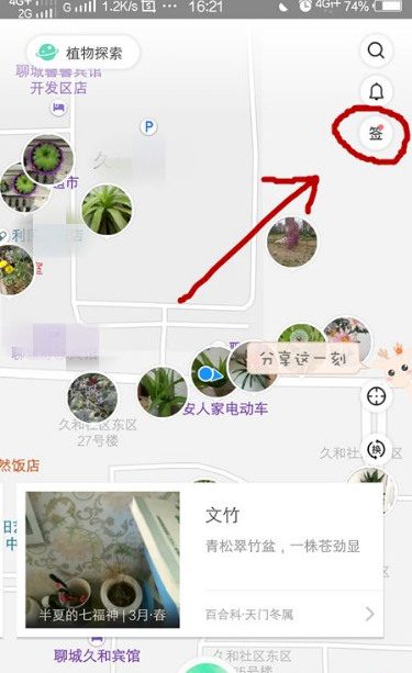 我们进入遇见之后,会进入你所在的地图,我们点击右上角一个签到的签字。