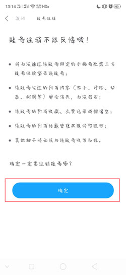 4、仔细阅读文中内容,等待10秒,点击下方的确定即可注销账户