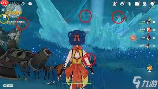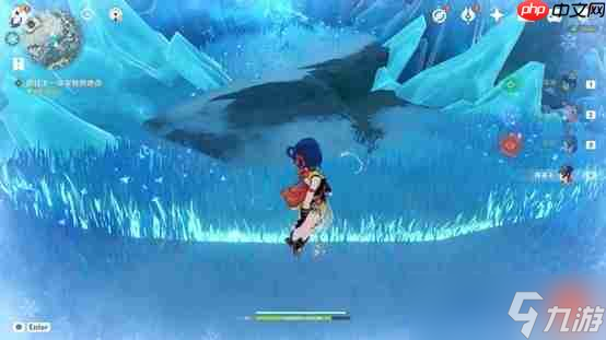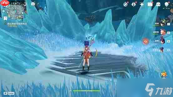 需先完成冰湖中央的挑战任务,屏障才会解除。之后利用周围的深赤之石打破坚冰。
