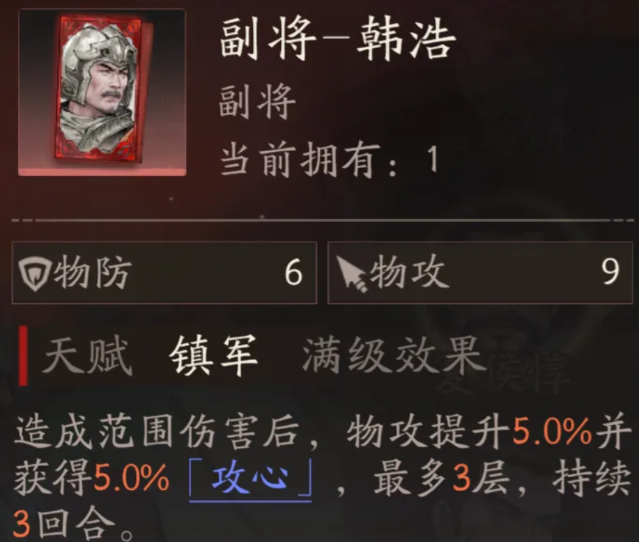 韩浩在游戏中定位为高品质的物理系辅助型副将,基础物理攻击达到9点,而物理防御为6点,属性分配偏向进攻端。其核心主动技能名为“镇军”,可在对敌方多个目标造成范围伤害后,为主将单位附加5%的物理攻击倍率提升效果,并额外施加3.2%的攻心状态,该状态最多可叠加三层,持续三个回合。这一机制使其在配合高频出手或AOE频繁的主将时,能最大化输出增幅。此外,韩浩还拥有专属韬略技能,在战斗过程中若主将触发反击动作,则可为其增加1.5%的反击伤害,并额外提供2%的所受伤害减免,进一步增强战场生存与反打能力。想要获得韩浩这名角色,玩家需参与游戏内的“仙人探宝”活动玩法,通过收集“时之精”道具后,在探宝系统中进行抽取获取,属于概率性获取的稀有武将单位。当韩浩与夏侯惇组成搭档时,能够实现高度协同作战。夏侯惇的招牌技能“刚烈武骑”可频繁触发普攻与反击行为,从而激活韩浩的“镇军”效果,叠加攻速与吸血增益。尤其在夏侯惇进阶至三阶段后,解锁核心技能“雪恨”,每次受到攻击均可发动反击,完美契合韩浩的韬略被动,形成持续性的伤害循环与防御减伤体系。得益于夏侯惇高频率的反击机制,搭配韩浩后可以快速叠满三层“镇军”的物理攻击加成与穿透效果,使得整体输出足以无视敌方重甲单位的防御优势。面对以重装兵种为核心的敌阵时,这套组合展现出极强的破防能力和压制力。值得一提的是,韩浩所提供的攻击增益同样适用于所有范围类技能,包括主公技“箭雨”。该技能会对范围内敌人造成相当于自身基础攻击力30%的物理伤害,并附加等同于谋攻值30%的额外伤害。在韩浩的buff加持下,这些伤害均可享受攻击倍率提升与穿透强化,显著提高清场效率。