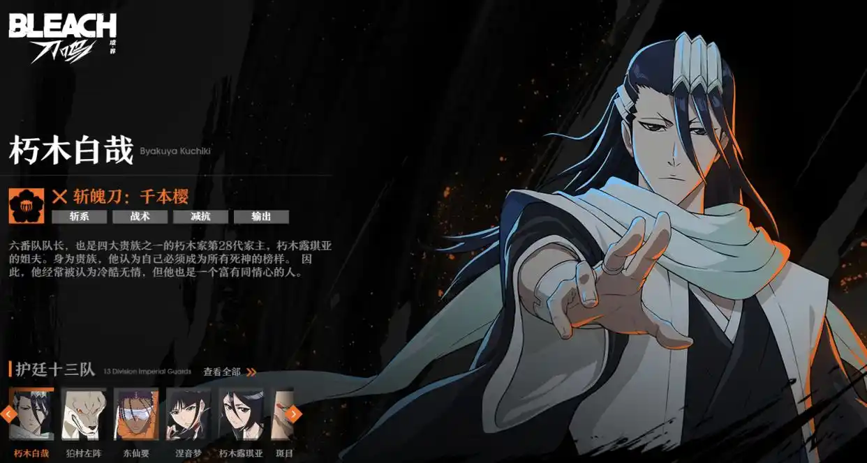 这一套阵容是一套比较吃操作的流派,比较适合去和高强度的boss或者是精英野怪战斗,四枫院夜一能够凭借着高速的突进直接把敌人的技能给打断,朽木白哉则可以利用控制技能牢牢的把控战场全局,斑目一角则需要利用自身强大的攻击属性快速的在战斗中收割对手。