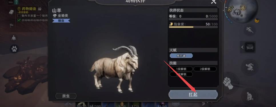 比如捕捉山羊,简直是一个非常实用的宠物,玩家可以制作一个捕兽陷阱,等山羊走过来就能自动给捕捉了,如果被捕兽网弄得伤势过重就得治疗,或者直接扛起回家,之后再圈养一段时间就可以驯服了,山羊不仅能够继续帮助大家采集树木,也就是冲撞树木,之后我们拾取,在前期会给予我们资源产生的帮助。