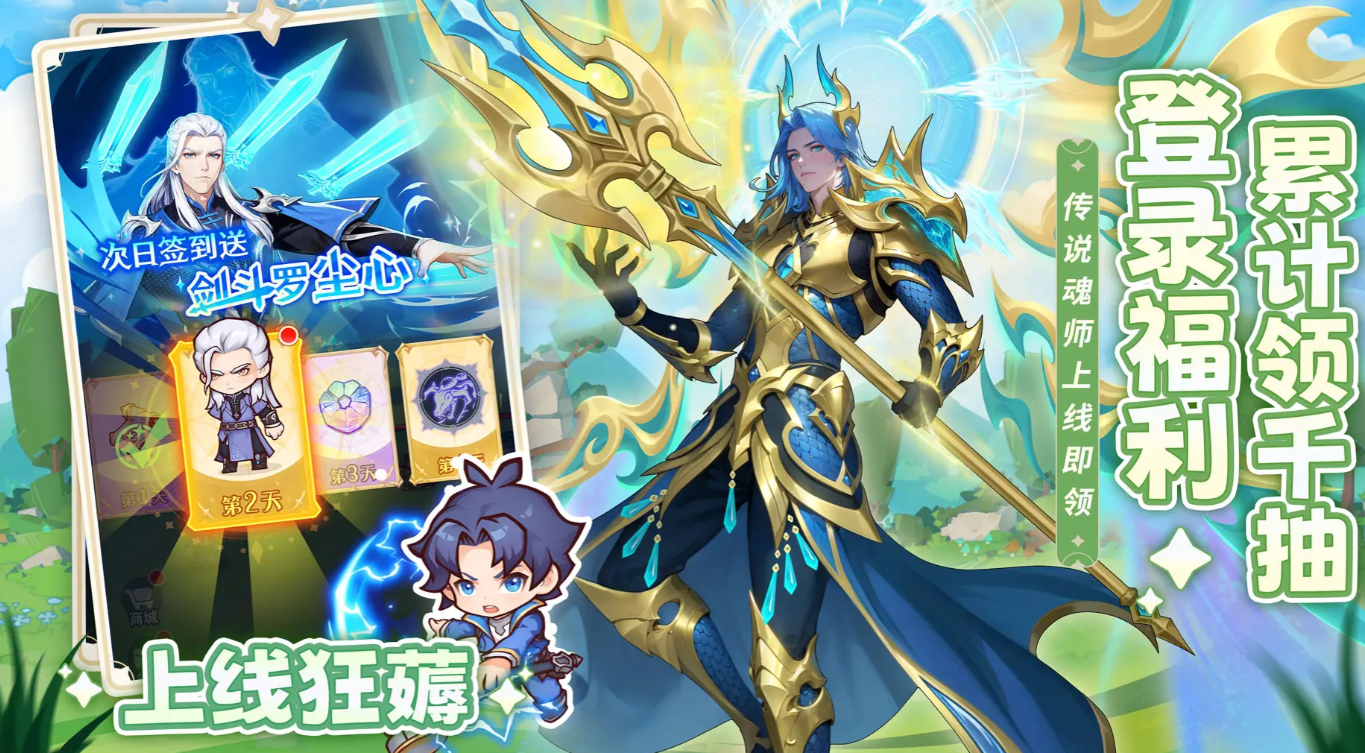 如若玩家先前已经预约了游戏,在公测进入之后,还可以直接在邮箱当中领取到招募水晶,新手玩家可以直接免费领取到十枚,同时,新手玩家的七天签到当中,于第二天签到时,即可取得金色魂师角色剑斗罗尘星,该角色强度不俗,可以帮助玩家推进所有的主线挑战。