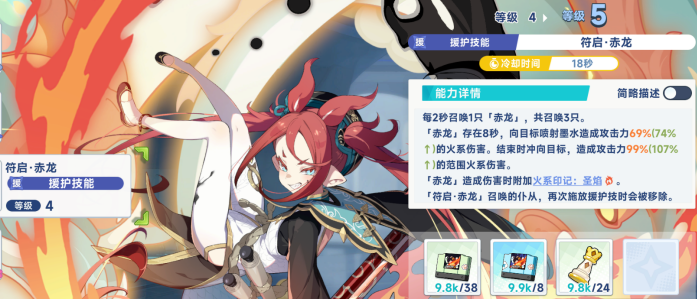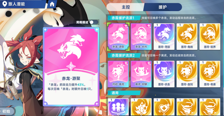 天赋系统就会围绕援护玩法,主要会分成两个流派,那第1个就是赤龙流派。核心就是强化召唤物的数量,还有印记的覆盖效率以及伤害范围。赤龙游聚这就是核心的天赋,也是必须要点的,在选择之后就能提升40%的赤龙攻击率。不管是持续喷射墨水的伤害,还是结束时的冲刺范围伤害,都可以得到一个显著的提升。在满级之后,赤龙单次喷射的伤害就会从原本的67%提升到74%。冲刺的伤害会从99%变成107%。