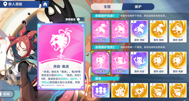 另外还可以选择寅虎流派,如果火队一开始缺少前排承伤或者单体高伤的角色。寅虎流派就是较好的选择,核心是将召唤物直接从远程赤龙更换成近战寅虎。符启寅虎是流派切换的关键,可以将赤龙直接强化成寅虎。生存的能力会超过赤龙,存在的时间超过15秒,要额外的增加7秒,并且每相隔两秒还可以提升50%的自身攻击力。伤害模式也会很有爆发力,可以造成攻击力多段范围火系伤害,单体输出能力就会远远的超过赤龙。当然还可以选择去搭配一些配套的天赋,就能进一步的强化作战的能力。