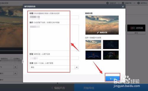 给视频填写相关信息。根据界面提示进行填写相关视频内容信息,编辑完成后点击“下一步”按钮。如下图所示