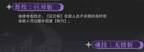 其基础攻击为巨刃斩,共四段连续挥砍,动作流畅且具备实战价值。当敌人处于倒地状态时,成功命中可额外回复耐力值。由于耐力直接影响核心技能释放频率,这一设定使他在压制阶段能持续施压。在第二段或第三段普攻过程中,玩家可主动衔接无情斩,提升伤害的同时进一步强化对倒地目标的续航能力,实现普攻与魂技之间的高效循环。这种机制让他在面对群体敌人时表现尤为出色。