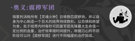 腐秽军团作为奥义技,是其成为团队支柱的重要保障。该技能消耗全部灵魂火种展开结界,在范围内持续为友方单位提供治疗,且治疗效果随时间推移逐步增强。在逆境团战或BOSS残血反扑时,往往能实现逆转局势的战略价值。