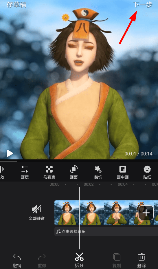 2、而在成功导入视频素材之后,从编辑页面的右上角选择“下一步”功能,这样就可以进入视频生成页面来设置片头了。
