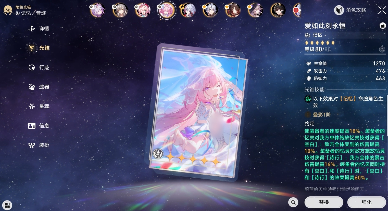 昔涟是冰属性的记忆角色,普通状态下昔涟可通过战技为队伍提供真实伤害加成,并为自己的大招提供3点追忆充能,同时队友和队友忆灵的行动,也能为昔涟提供追忆充能,等昔涟的追忆点数达到24点后,便可开启大招让自己进入特殊状态“往昔的涟漪”。此时昔涟会以忆灵形式登场,激活全体队友的大招,并能挑选一名角色为他进行强化,亦或使用忆灵技对敌方全体进行攻击,两种效果只能选取一种。