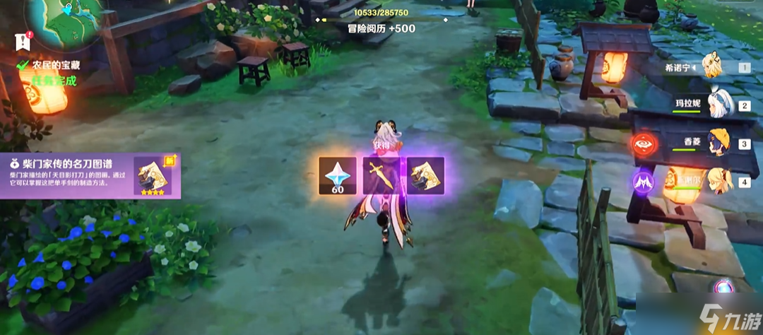 集齐石板后返回刃连岛与柴门二郎对话,触发后续剧情需击败盗宝团与愚人众组成的敌人。战斗分为多波次,最后一波包含风拳、水胖等组合,建议优先处理治疗单位。胜利后获得宝库钥匙,开启宝库需将石板嵌入机关并点亮全部地面符文。完成解密后取得宝藏,最终向绀田村的柴门克巳汇报即可领取天目影打刀锻造图纸。