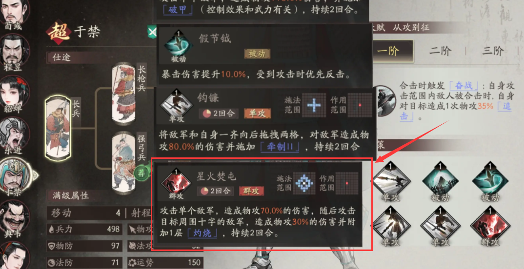 于禁的主动技能“星火焚屯”拥有两回合冷却时间,属于群体攻击技能。首次命中单体目标时造成等同于自身物理攻击70%的伤害,随后向周围十字区域扩散,对范围内所有敌军造成30%物攻的溅射伤害。