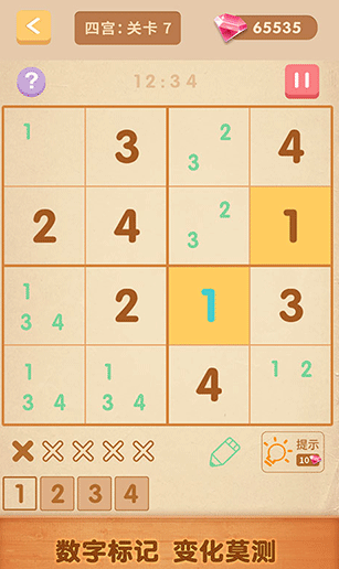 适合追求高难度挑战的用户,尤其推荐给希望强化思维训练的玩家。支持选择不同规格的宫格进行游戏,主界面采用经典黄色调,观感柔和。每局题目数字分布随机生成,避免重复枯燥。支持标记功能,便于记录候选数字,提升解题效率。当陷入困境时,可点击提示获取帮助,但每次消耗10个钻石。通关后可获得钻石奖励,当前持有数量可在右上角查看。