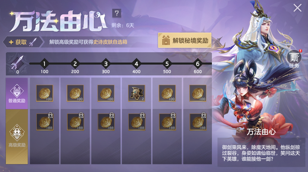 完成任务提升等级免费获取3天满级星盘特权卡、英雄碎片等奖励;付费30元可得史诗皮肤自选箱、头像自选箱;付费98元可额外获得传说皮肤自选箱、橙心钻等奖励。
