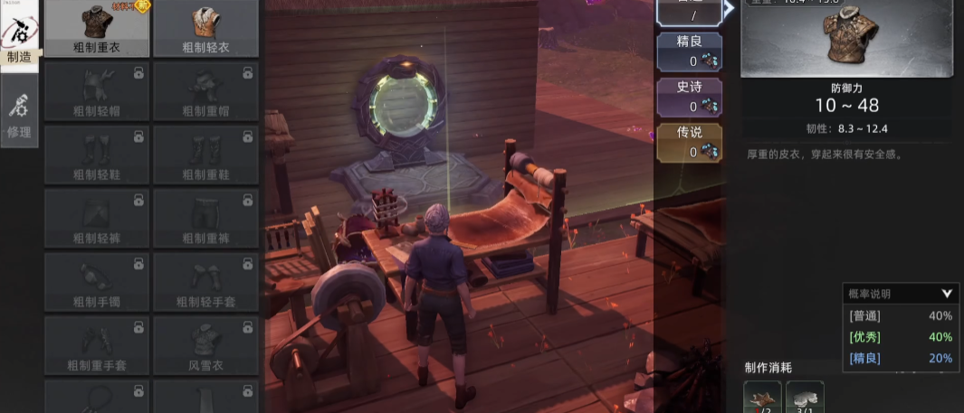 在这个世界生存,危险重重,要面临各种外部的威胁,比如野兽,恶劣的天气环境等,因此对新手而言,装备与武器就是前期生存的保障,一开始一定要尽快利用木材,石头,去将石斧和石矛制作出来,这两个装备不仅能加快采集材料的进度和效率,也是一种不错的武器,虽然说攻击力不是很高,但是应对业主,野狼之类的小型生物是足够的,之后等累计更多材料后,再根据个人战斗风格,去打造更加强大的武器,例如近战的长剑,远距离的弓箭等。
