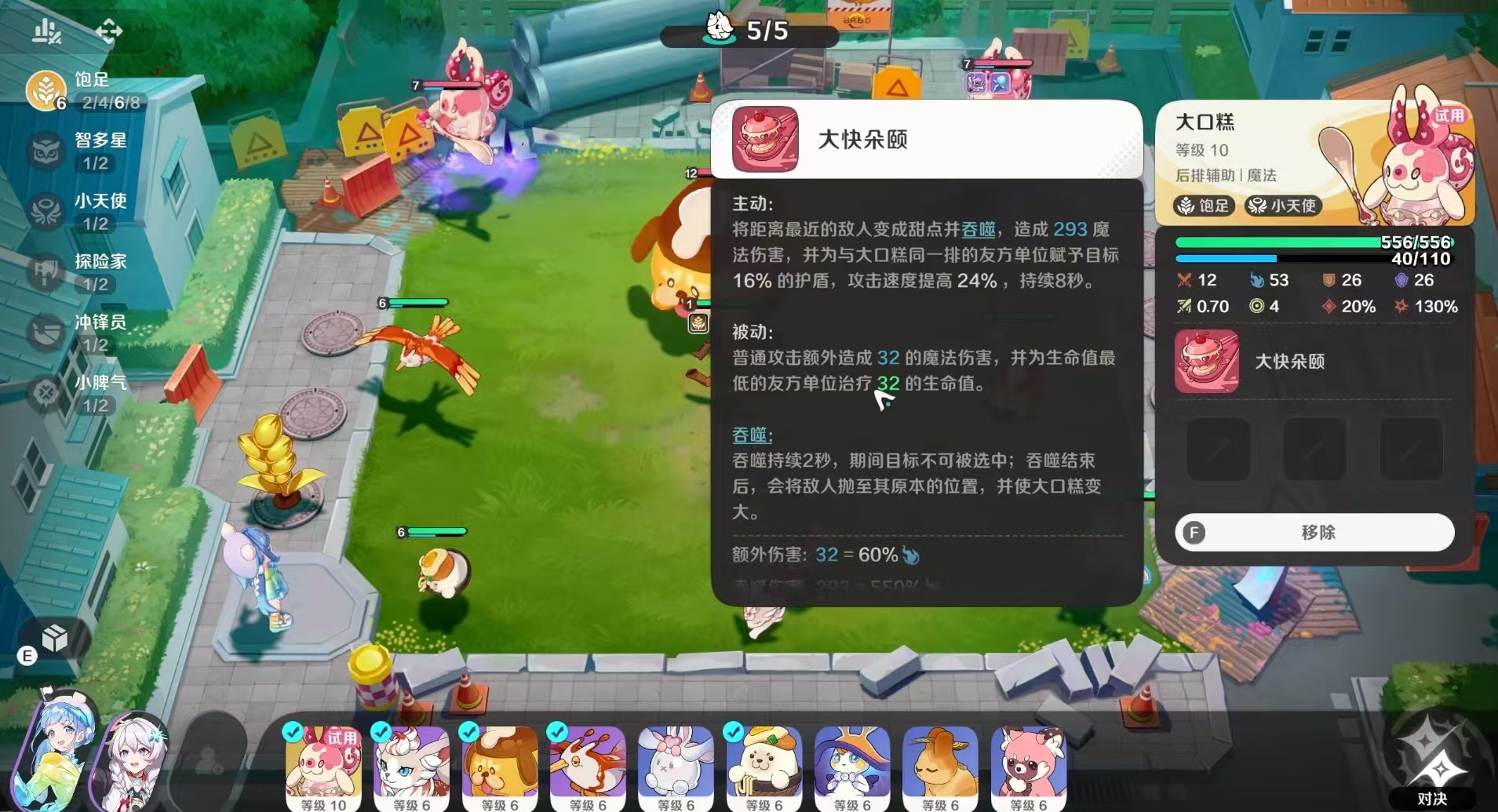 另外被治疗之后还可以提升单位的攻击力和魔法强度,叠加到5层之后,强度非常可观。目前最佳效果就是直接选择八饱足,这样能够获得高额属性加成,使得饱足精灵的体型增大,生命上限提升,造成的伤害增加。例如和憨堡、奶丁汪等一起出战,就是非常适合的选择。有了大口糕所带来的护盾和攻速加成,憨堡的输出能力会得到进一步提升,奶丁汪也能够在前排扛住大量伤害,配合上其他的饱足精灵,整体强度可观。这样的玩法还有一个很有特点的优势,就是场上的精灵体型会非常大,这样看起来更有压迫感。