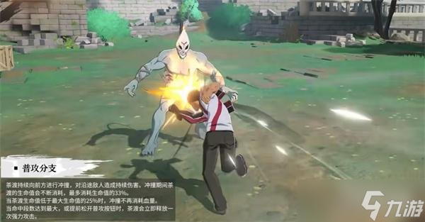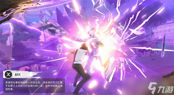茶渡使用擅长的过肩摔技巧,将面前的敌人按倒在地,造成伤害,接着以惊人的力量将倒地的敌人掷出,造成伤害。随后可立即点击普攻按钮,朝前方敌人释放贯穿一击,并积累较多灵压。