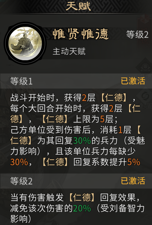 刘备的核心技能是仁德,该技能的辅助和控制效果很强,对我方单位受到伤害时消耗一定层数的仁德,为我方恢复兵力和血量,刘备的等级2技能还会减少20%的伤害,我方队友受到的伤害减少,队伍的生存能力增强。当刘备的仁德技能达到3级后,将会有一个质变,可以把仁德给敌方,当己方单位受到攻击时,会对敌方叠加仁德层数,最多可以叠加4层,当叠加到4层时,会对敌方单位造成罚站,下一次行动无法行动。克制一些高频率攻击以及强力aoe的敌方英雄,可以有效的降低敌人的输出节奏,保证己方存活以及反击。