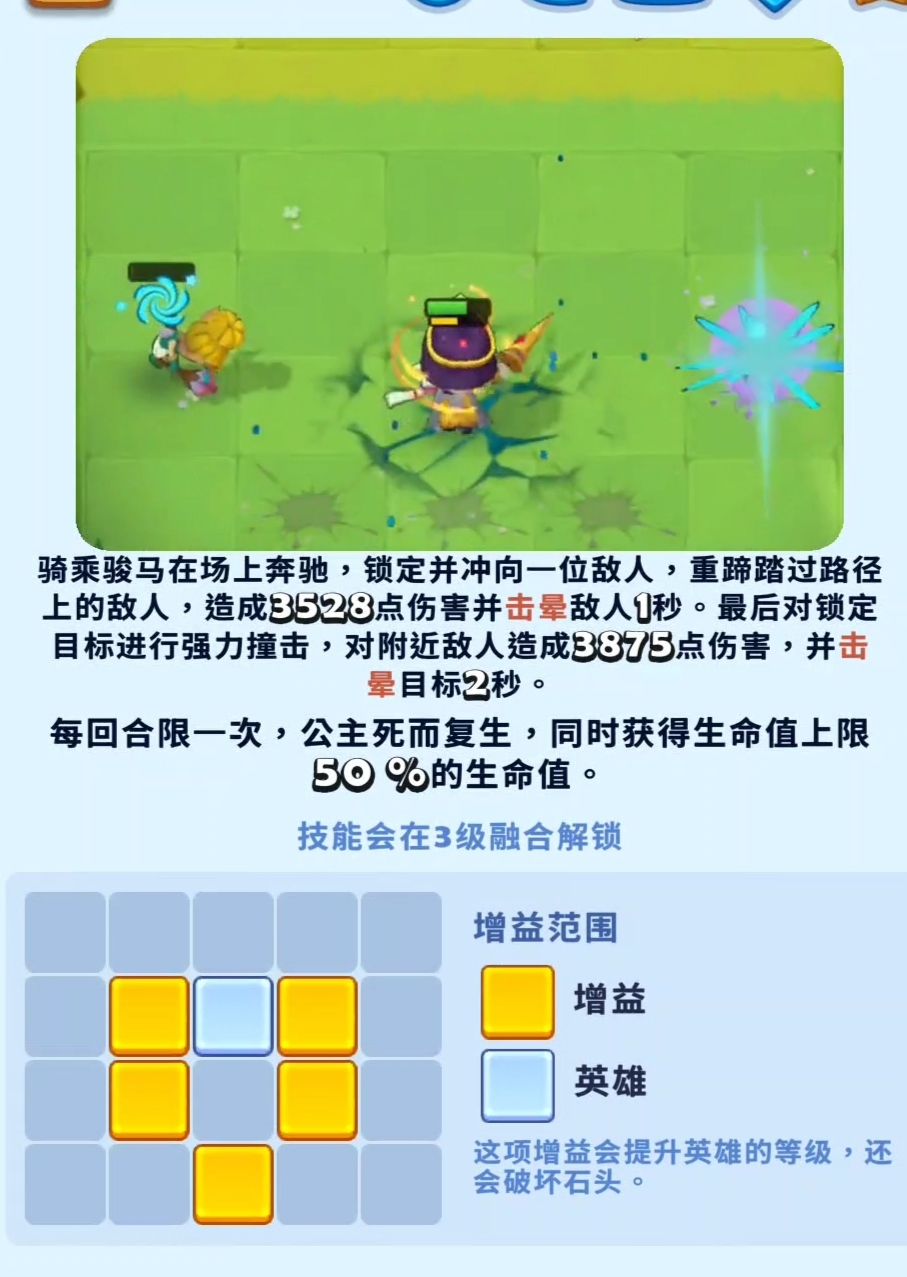 公主的核心技能是会骑乘骏马在场上奔驰,锁定并冲向一位敌人,沿途碾压造成3528点伤害并击晕敌人1秒。冲锋结束后,她会对目标进行强力撞击,造成3875点额外伤害,并使目标再次晕眩2秒。这也让公主能在短时间内打出高伤害,还能打断敌人的攻击节奏,给队友创造反击的机会。