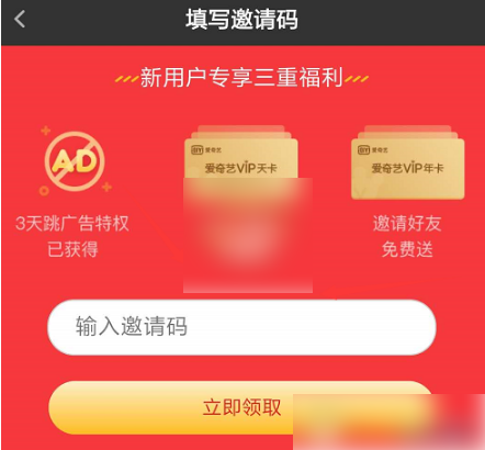3、将邀请码填写到框中,点击【立即领取】即可领取奖励。