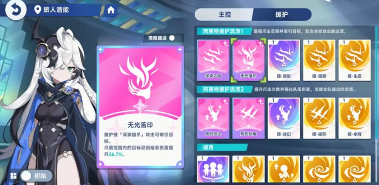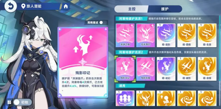 她本身强度上面也有很高的战斗潜能可以搭配,而且珂塞特本身在覆盖率上面也是比较高的,技能搭配好潜能的话,甚至在实战范围上面可以做到全程覆盖的能力,那么此时给敌人带来的负面影响效果才是最高的,她的这个残影印记,就是利用她的援护技能深渊猎爪带来的攻击次数提升效果,这里会有4次提升之后,珂塞特每一次挥爪的时候,那么在激发攻击提升上面会有4.6%的提成效果,这样的残影印记,后续在敌人身上也是会持续施加5秒的效果,最多的情况下可以叠加到三层,那么三层的百分比加到一起的话,珂塞特她本身的攻击提升效果就会达到12%左右,那么在珂塞特的潜能方面,为她搭配这样的残影印记之外,还可以给她搭配一个无光落印。