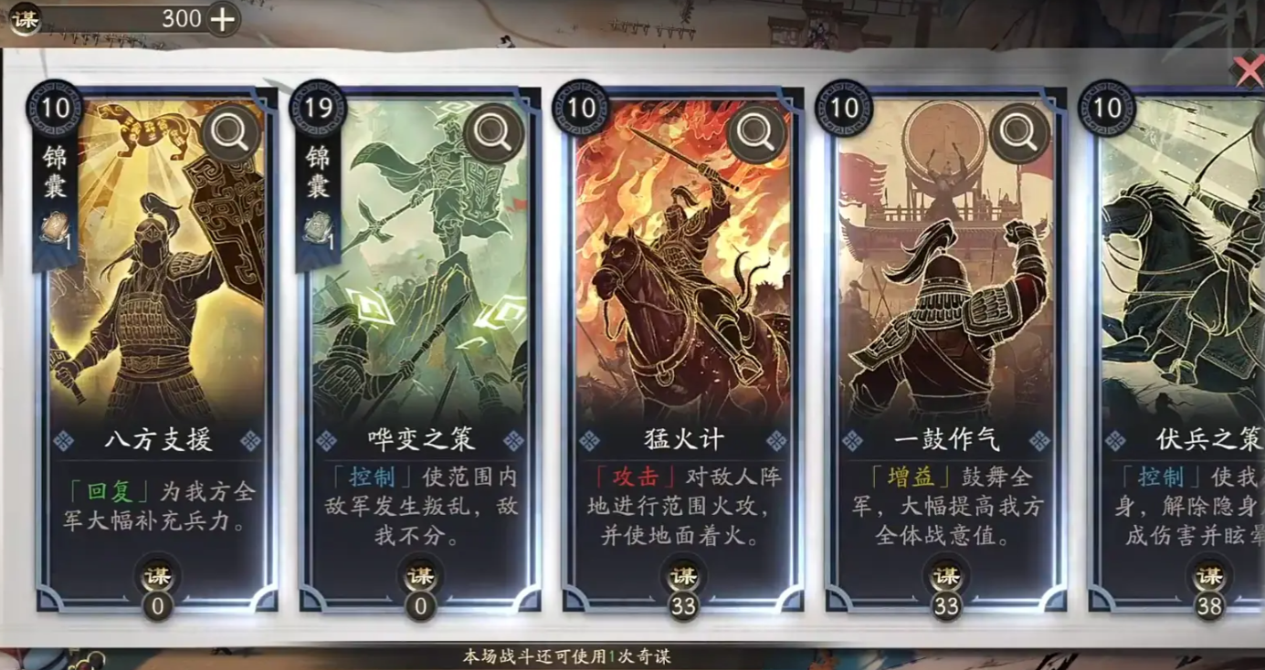 在锦囊的搭配方面,玩家可以直接使用一鼓作气,直接鼓舞全军士气,提升战意素质,亦或是使用伏兵之策,增加伤害效果。