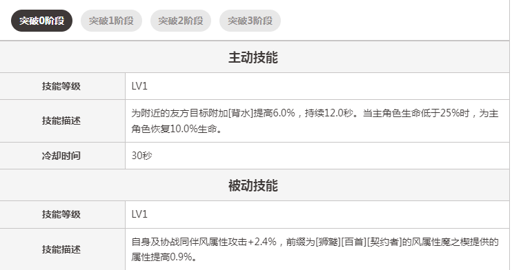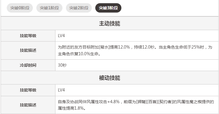 先来看一下获取的方法,获取方法比较简单,只有一个途径,那就是吟游诗集。接着就是看一下技能的机制,不管是被动技能还是主动技能,都会比较适合风属性的队伍。第1个技能就可以给附近的友方成员增加一个背水的属性,而伴随着等级的提升,背水属性就会有所改变。持续的时间是固定12秒,但是冷却是30秒。第2个就是主角色血量一旦在低于25%之后,那马上就可以恢复百分之的生命值,这个续航在血量缺少时是比较关键的。