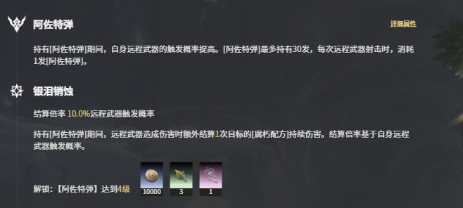 阿佐特弹这就是核心的机制,只有子弹时就能迅速的提高远程武器的触发概率。每一次射击就会消耗一发,可千万不要小看这发子弹,在解锁之后,用子弹射击时就可以额外的结算持续伤害,相当于变相的提高输出。接着还要看一下搭配的思路,这本身就是一个风属性辅助,队伍里面最好是搭配风属性输出角色,例如风属性主c,这样的进化配方风属性就可以追加伤害,直接达到最大化。在资源的分配上突破优先到4级就可以直接解锁被动技能,在进入到第5阶时就可以解锁攻击提升,增加30%的被动效果。