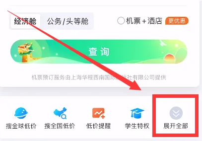 3、打开机票页面,点击箭头所指的【展开全部】按钮